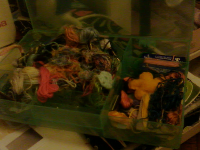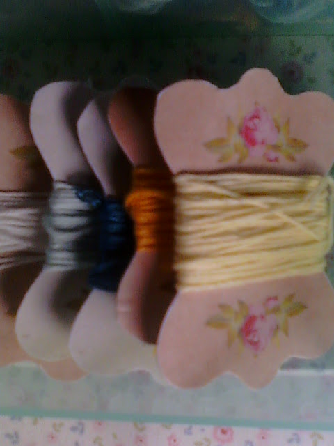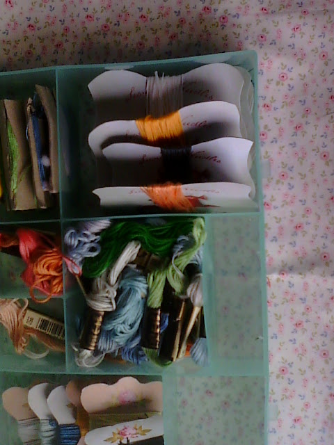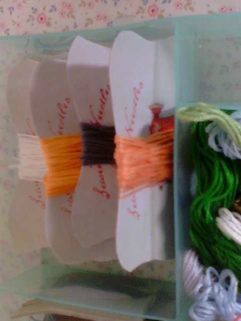 A primeira foto foi tirada de noite e mostra uma caixa de linhas de bordar, num estado caótico, depois arrumadinho com aqueles cartões que vêm num do livros Tilda que tenho, é tirar cópia, colar num cartão mais rijo, cortar e fica logo com um ar mais mimoso/tildesco, mesmo como eu adoro!