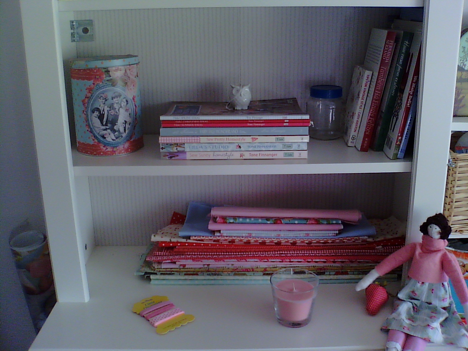 Claro que eu neste momento tenho a sorte de ter um espaço só para mim/nós, mas começou exactamente neste canto que vou mostrar, com uns poucos tecidos, sem tesouras XPTO, nem nada, apenas eu a escrivaninha, a SINGER da minha mãe, e tecidos comprados a medo, e com medo de os cortar depois!